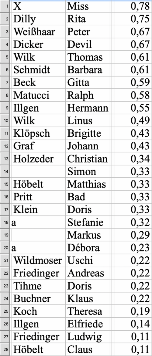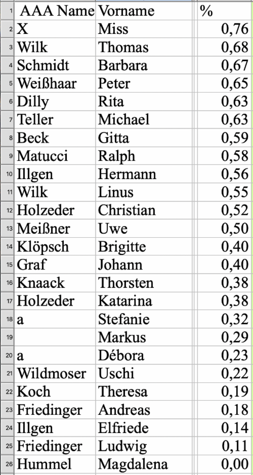 AAA Name Vorname gesamt % (1 = 100 %)
