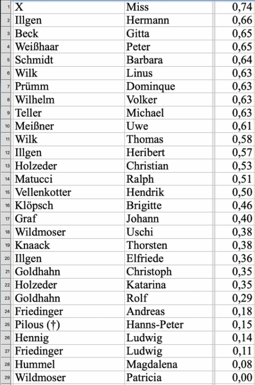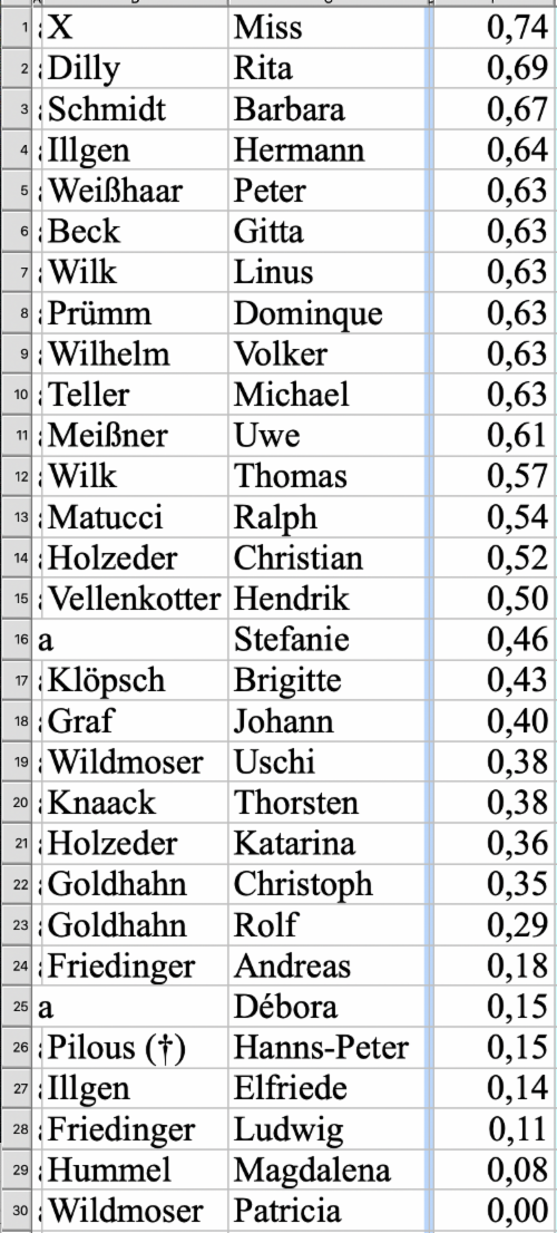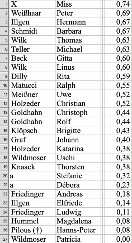 AAA Name Vorname gesamt % (1 = 100 %)